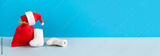 Merry Christmas and Happy New Year greeting card poster template. Santa Claus red gifts bag, cap and white felt boots on blue gray background. copy space for holiday congratulations text