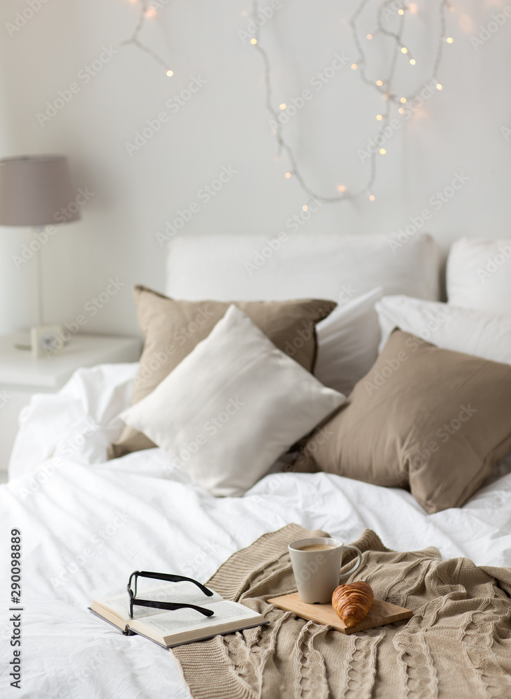 comfort, hygge and interior concept - coffee, croissant, blanket and book on bed at cozy home