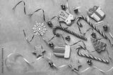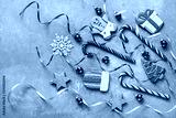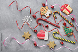 Christmas gingerbread cookies, candy cane, red balls, golden stars and snowflake on a gray textured background. Top view, flat lay.