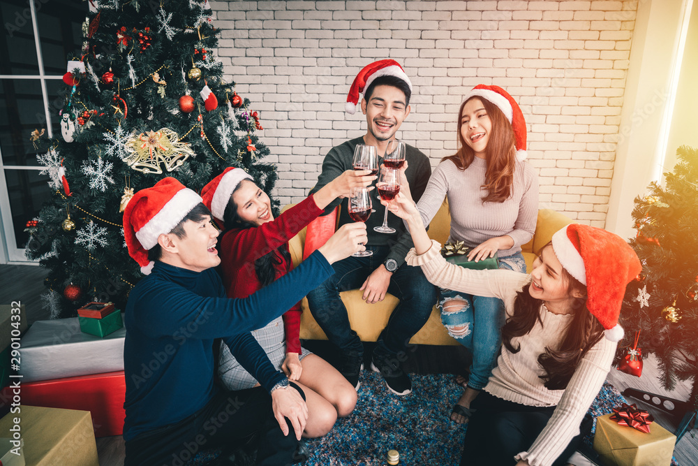 Friends man and woman or young people are gathering for Christmas and New Year holiday, spending time together, drinking champagne, smiling at each other, and celebrating the happiness festival
