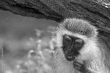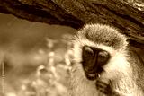 A vervet monkey nibbles on a blade of grass