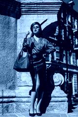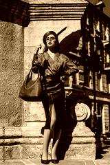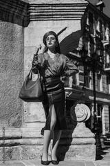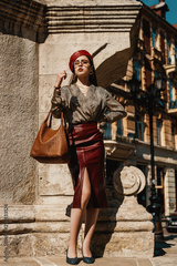 Outdoor full-length fashion portrait of elegant, luxury woman wearing trendy leather dark red pencil midi skirt, beret, snakeskin print blouse, shoes, sunglasses, holding brown bag, posing in street