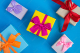 Multi-colored gift boxes with bright bows on the blue background. Top view.
