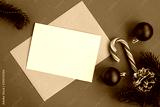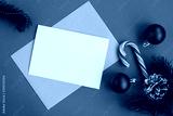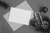 Blank white paper for text, envelope and christmas composition on the red background.Top view.Copy space.