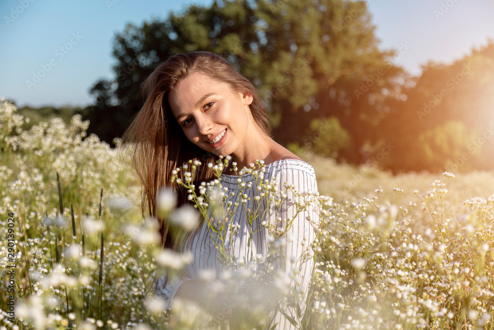 Cheerful young brown-haired beauty posing on a flowery forest edge