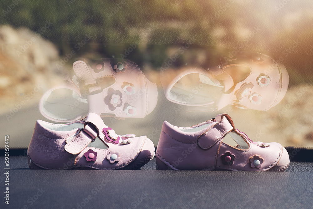 Concept pregnancy photo. Little baby shoes in the car. Raining outside