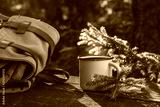 Enameled cup of coffee or tea, backpack of traveller on wooden board in summer forest outdoors.