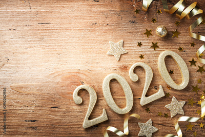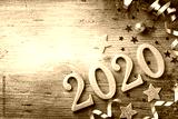 Happy New Year festive background with golden numbers 2020 and Christmas decorations on vintage wooden table top view.
