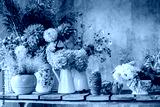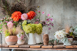 bouquet of white flowers in a glass jar in the hands of a girl florist on the background of a concrete wall.