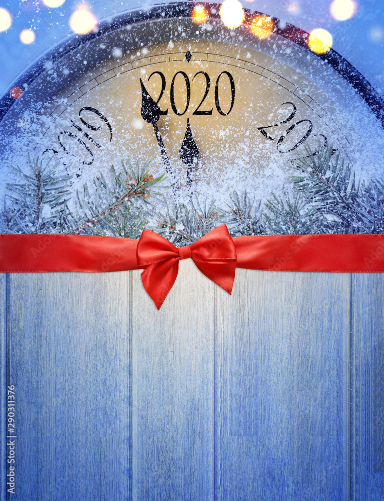 Countdown to midnight. Retro style clock on wooden table is counting last moments before Christmas or New Year 2020. View from above.