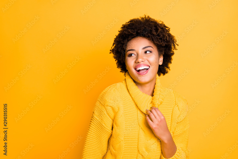 Photo of pretty dark skin lady listening humorous story wear warm knitted jumper with big collar isolated yellow color background
