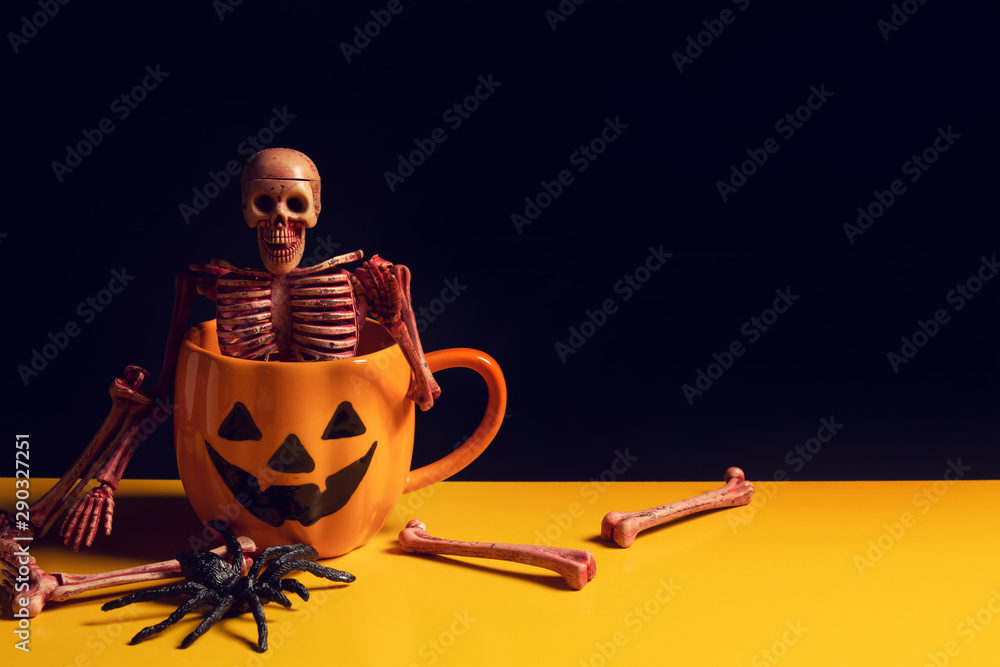 horror spooky funny ghost in halloween pumpkin on holiday season greeting night celebration party with toy prop decoration and trick or treat autumn october festival and jack-o-lantern concept