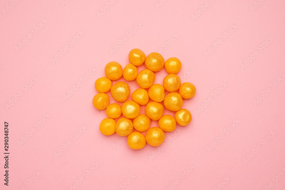 Sweet yellow candies on a pink background, round sweet food