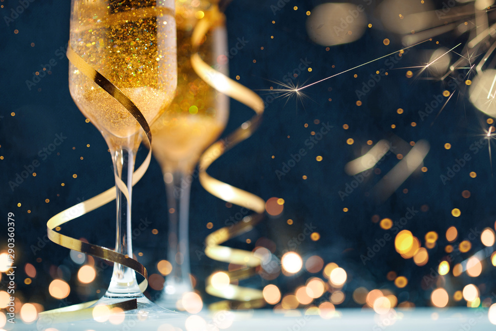Two glasses of champagne with golden confetti, glitter, serpentine and lights.