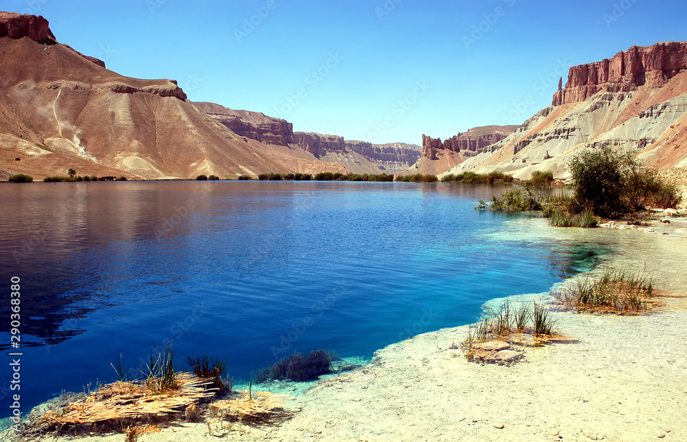Band-e Amir lakes near Bamyan (Bamiyan) in Central Afghanistan. Band e Amir was the first national park in Afghanistan. View with reeds from the shore of a natural blue lake at Band e Amir Afghanistan