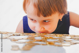 Best motivation is money. Happy business child with coints. Humorous photo.