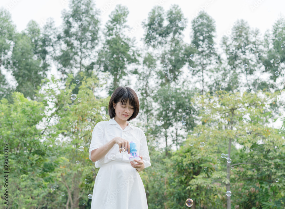 woman playing with soap bubbles machine
