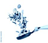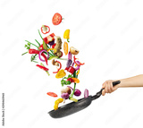 Cooking concept. Vegetables are flying out of the pan isolated on white background. Healthy food.