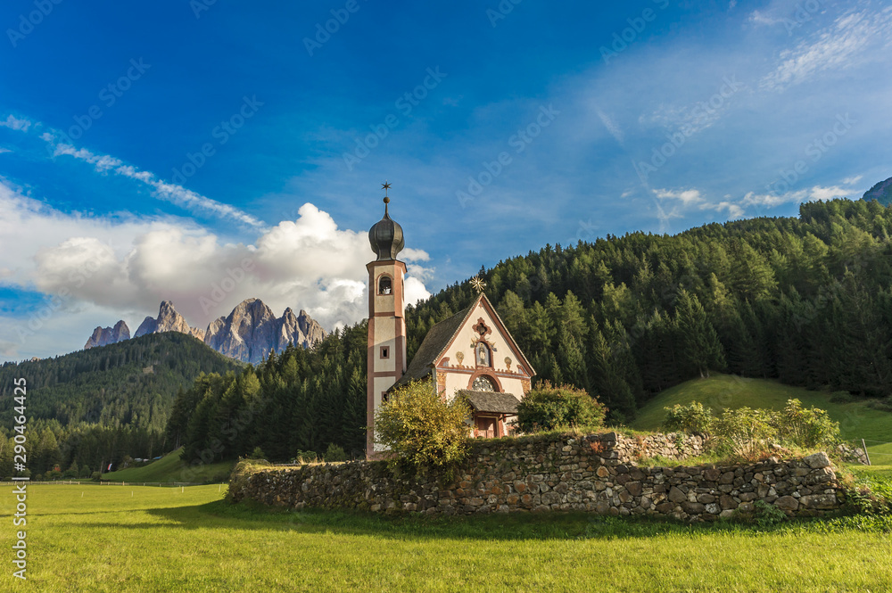 St. John church in front of the Odle mountains, Funes Valley, Dolomites, Italy