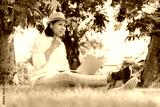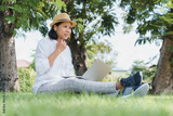Asian women wear hat are using laptop with wired headphones while sitting on grass green In the public park