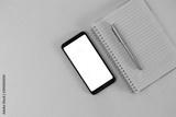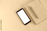 cell phone, notebook and pen.