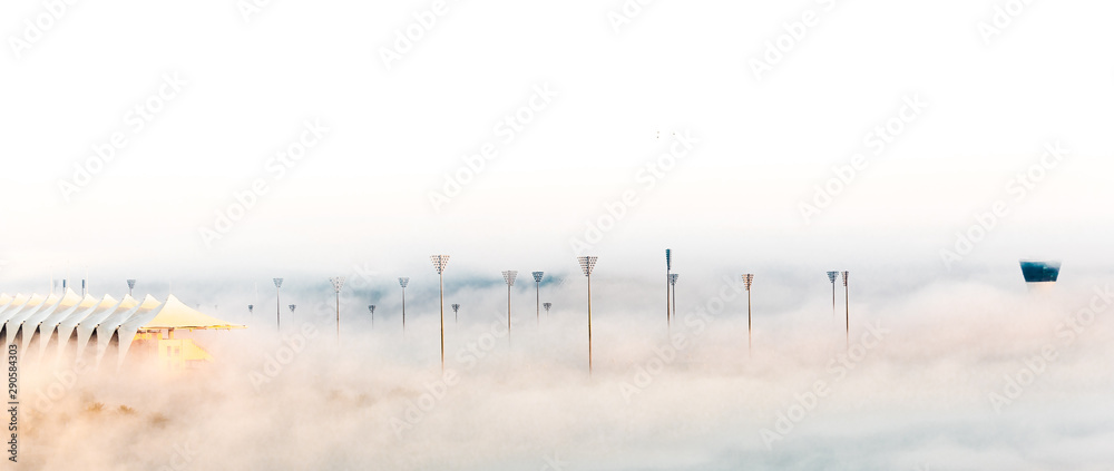 Landscape panoraic picture in Winter of Abu Dahbi Yas Island in the early morning when the fog came up and spreaded all over the island and covers all besides some lamp polls and a tower