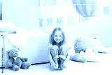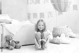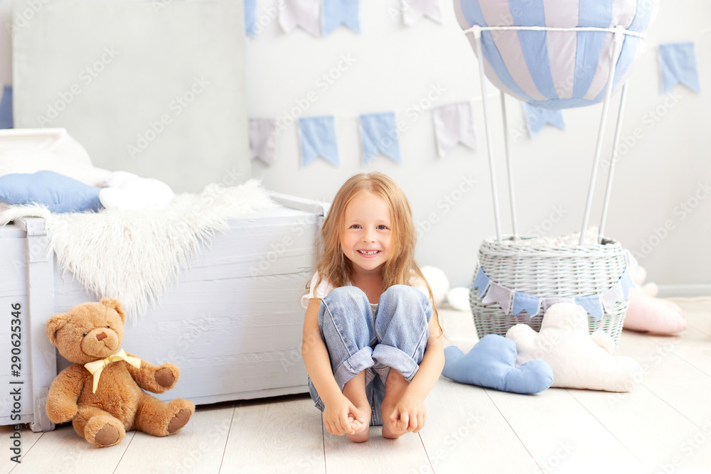 Little smiling girl in a white T-shirt and jeans sits on the background of a decorative balloon. The child plays in the children's room. The concept of childhood. birthday, holiday decorations