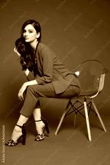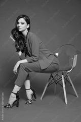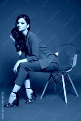 High fashion portrait of young elegant woman. Blue blouse, blue pants, curly hair, leopard shoes. .