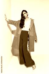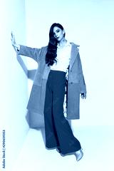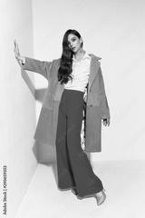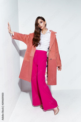 High fashion portrait of young elegant woman. Coral coat, magenta pants, white blouse.