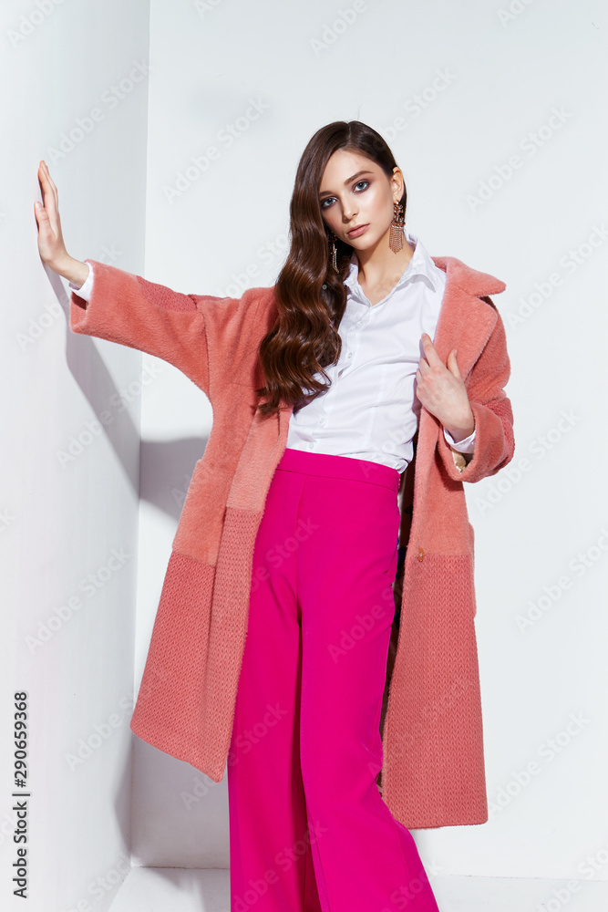 High fashion portrait of young elegant woman. Coral coat, magenta pants, white blouse.
