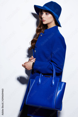 High fashion portrait of young elegant woman. Blue coat, hat, bag.