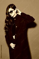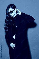 High fashion portrait of young elegant woman. Blue coat, hat, bag.