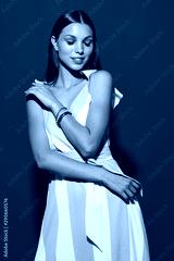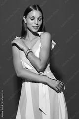 Fashion portrait of young elegant woman. Yellow dress with white strips.