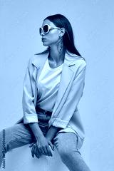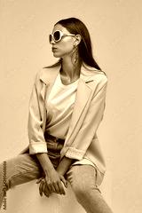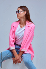 fashion portrait of young elegant woman. Pink jacket, blue jeans, sunglasses.