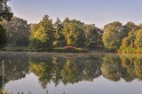 Beautiful morning summer landscape. Green trees and plants by the pond in the park.