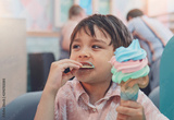 Portrait of happy kid boy y eating ice cream in the shop. Cute toddler with smiling face enjoy eating colourful ice cream on waffle cone.