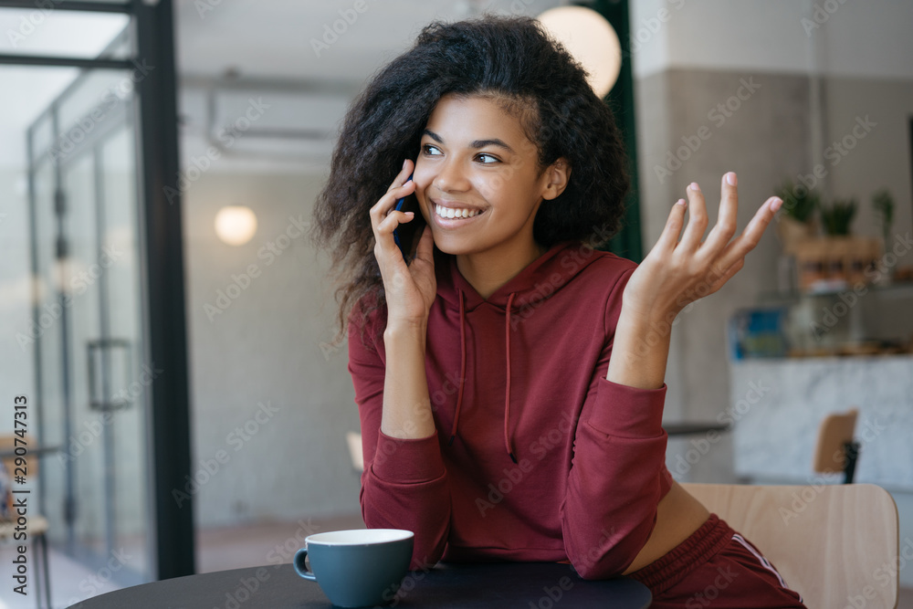 Cheerful African American woman talking on mobile phone, sitting in modern cafe. Authentic portrait of beautiful curly haired hipster girl holding smartphone, laughing, communication