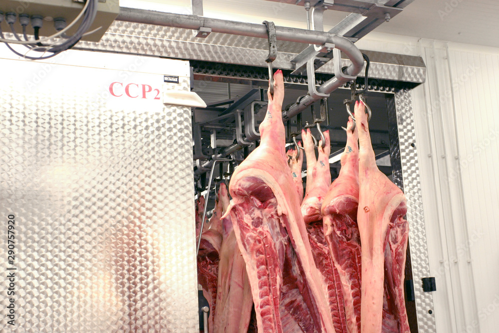 Pork hanging on hooks in a slaughterhouse