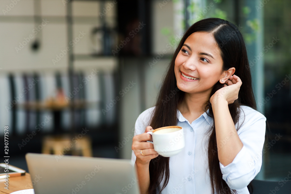 Asian woman in blue shirt working and drink coffee in coffee shop cafe vintage color tone