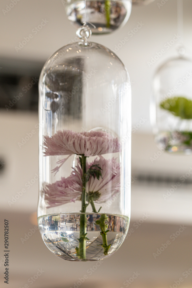 Selective focus flowers in glass bottles hang on the air.Home decoration concept.