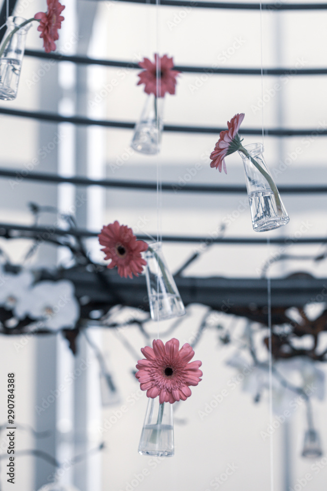 Selective focus Gerbera daisy flowers in glass bottles hang on the air.Home decoration concept.
