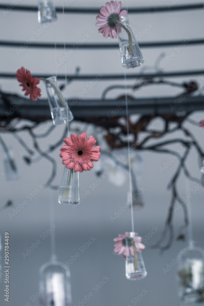 Selective focus Gerbera daisy flowers in glass bottles hang on the air.Home decoration concept.