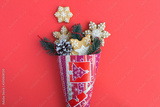 Christmas gingerbreads in the paper gift bag on the red background. Copy space. Top view.