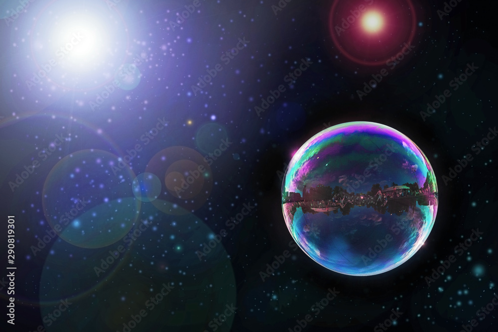 Huge rainbow soap bubble, reflection of the city and people inside, space in the background, Earth concept as a soap bubble, save the planet