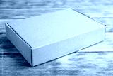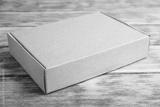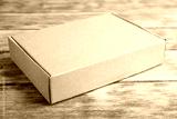 Closed cardboard box on brown wooden table