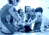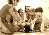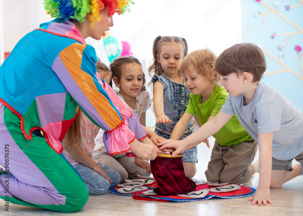 Group of happy smiling preschool kids watching at clown show indoor. Party for children.