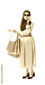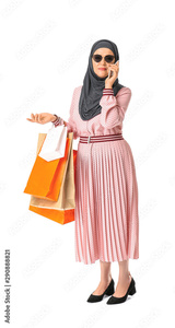 Beautiful mature Muslim woman with shopping bags talking by mobile phone on white background
