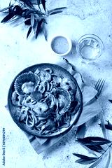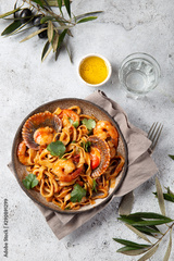 Seafood Spaghetti with seashells, prawns, squids on gray background. Italian mediterranean food concept