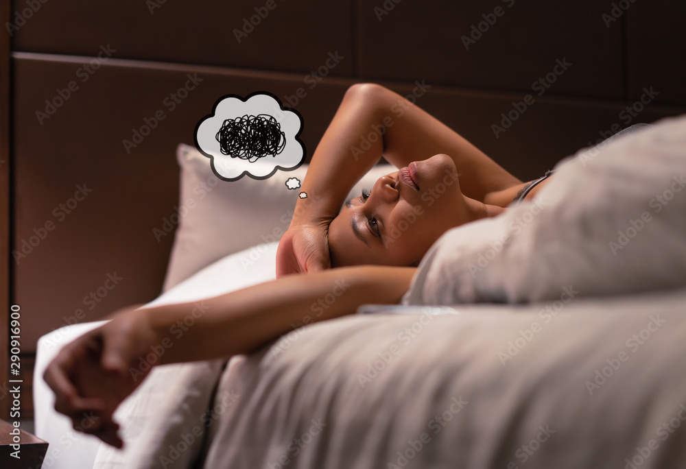 Young professional woman laying on hotel bed at night with confusion thought bubble graphic - Millennial girl dealing with mental illness alone and depressed - Depression, health and wellbeing concept