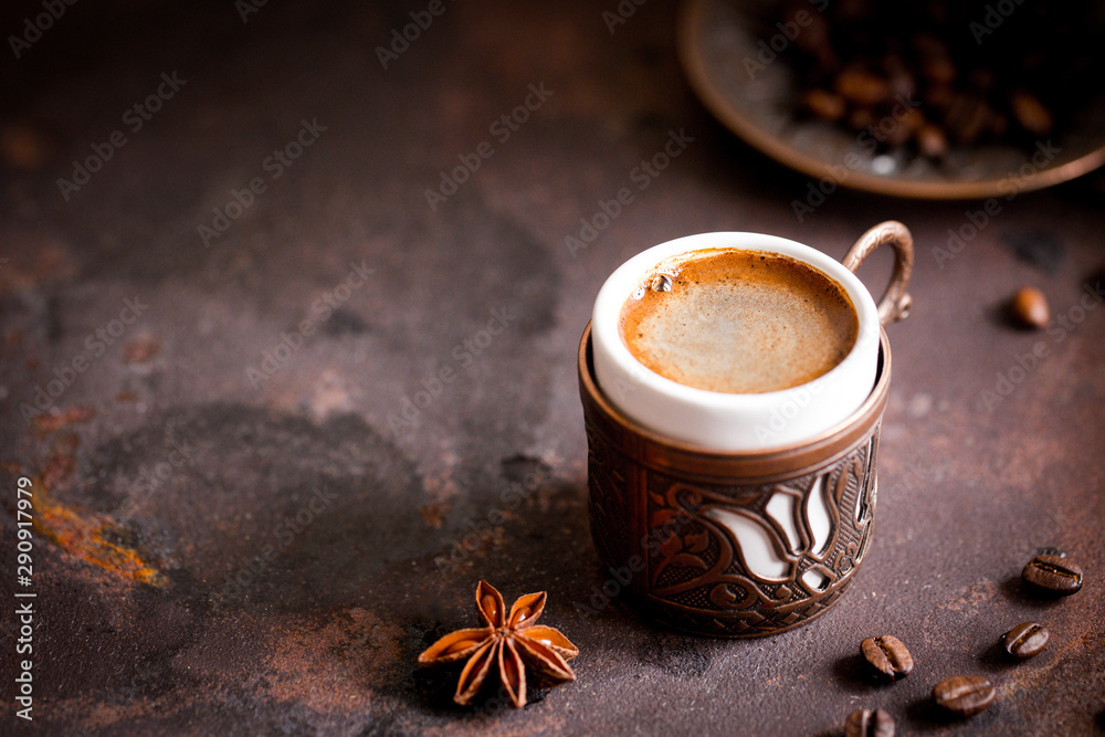 Coffee cup and beans on old kitchen table. turkish coffee and turkish delight with copyspace for your text